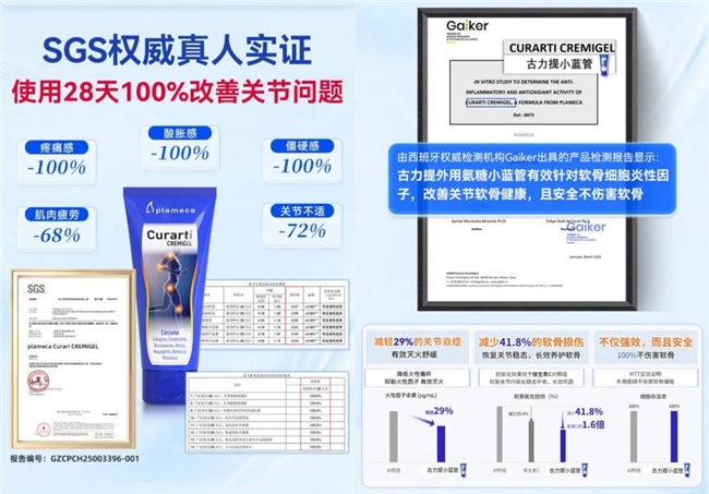 其修复舒缓效果已得到权威机构实证。由西班牙权威检测机构Gaiker出具的产品检测报告显示:古力提外用氨糖小蓝管有效针对软骨细胞炎性因子,改善关节软骨健康,且安全不伤害软骨。此外,由国际知名认证机构SGS通标标准技术服务有限公司出具的真人实证报告显示,连续使用古力提小蓝管28天,无论是关节酸胀僵硬不适,还是肌肉紧张疲劳,都能够显著改善。