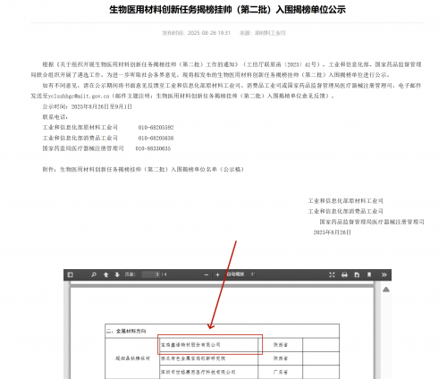 2025年8月26日,工业和信息化部联合国家药品监督管理局发布《生物医用材料创新任务揭榜挂帅(第二批)入围揭榜单位公示》,宝鸡鑫诺特材股份有限公司(以下简称“鑫诺特材”)凭借在超细晶钛棒丝材领域的技术突破,成功入围金属材料方向项目名单。此次入围标志着鑫诺特材在高端生物医用材料领域的技术实力获得,认可,也为我国突破医用钛合金关键核心技术、推动高端医疗器械自主可控提供了重要支撑。