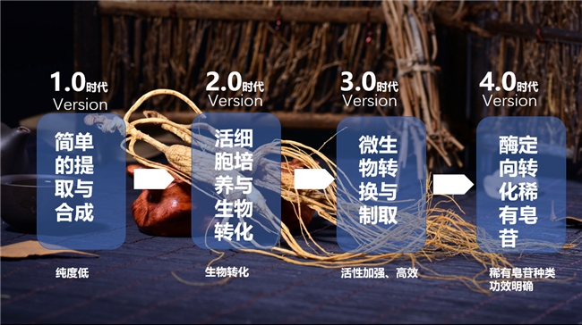 4.0时代:丁家宜已掌握精准酶解技术,能够定向制取稀有皂苷,实现人参精准护肤,让人参护肤进入功效明确、针对性更强的时代。