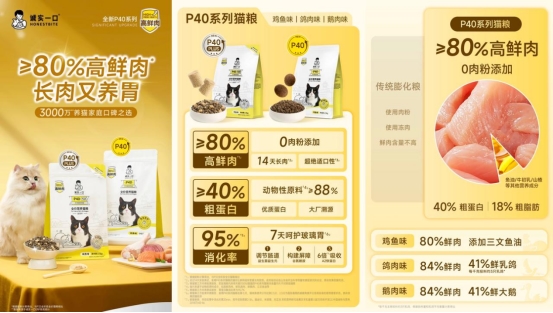 今年,诚实一口P40系列配方重磅升级,主打“高鲜肉零肉粉”,坚持选用人食级鲜肉,鲜肉含量≥80%,不添加肉粉,鸽肉口味主粮更是添加了41%的鲜乳鸽。此外,P40系列猫粮的不同口味还分别添加了鱼油、牛初乳、山楂等成分,营养更充分。P40 PLUS猫粮额外添加了10%冻干,适口性再升级,颗粒是肉丝包裹冻干,让猫咪吃的每一口都有肉。
