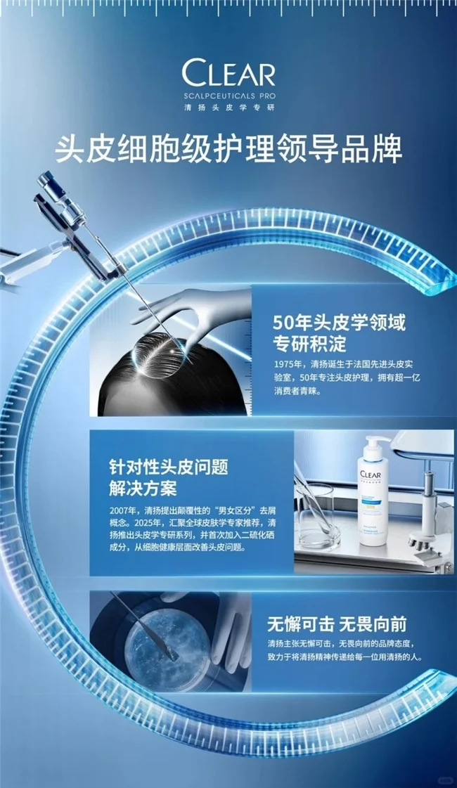 作为拥有50多年头皮护理研究历史的品牌,清扬联合全球5大实验室,持续投入头皮健康领域的研发。2025年4月17日,清扬于上海油罐艺术中心正式全球,品牌首款头皮学专研系列产品,"细胞级修护"科技成为关键词。