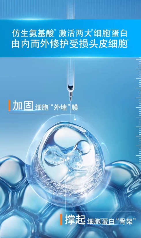 屏障修护组合:3重仿生氨基酸(丝氨酸、丙氨酸、甘氨酸)与98%高纯维生素原B5(泛醇),分别作用于细胞“外墙”膜与细胞蛋白“骨架”,帮助修护受损头皮表皮层屏障细胞。