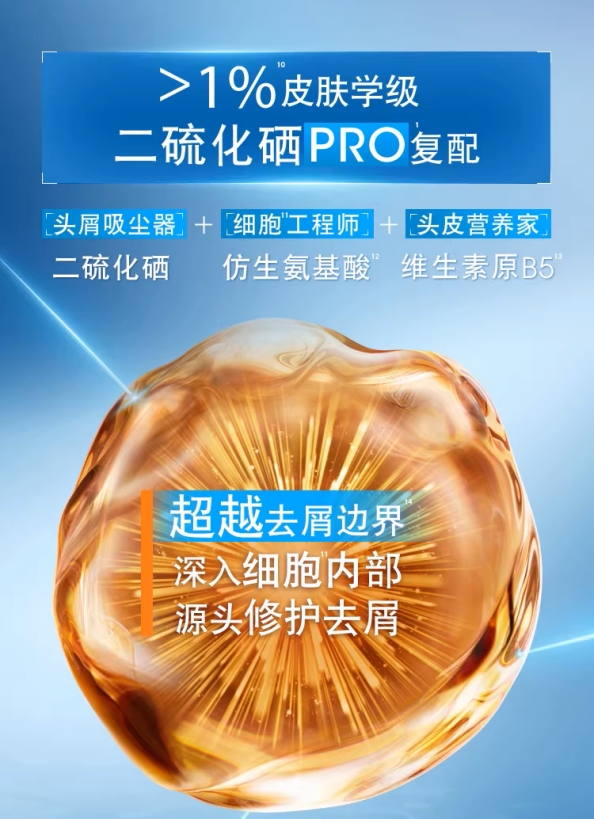 核心去屑成分:>1%皮肤学级二硫化硒PRO,被皮肤学专家认可为高效去屑成分,能较好平衡头皮微生态,同时抑制皮脂分泌,从源头减少头屑产生;