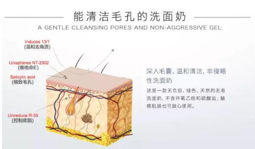 三大专利成分inducos13/1、Unispheres NT-2302和Unireduce R-35协作,实现从去油到控油,并以水杨酸抑制细菌、细致毛孔,实现毛孔级清洁,同时为肌肤注入能量,温和调节水油平衡。