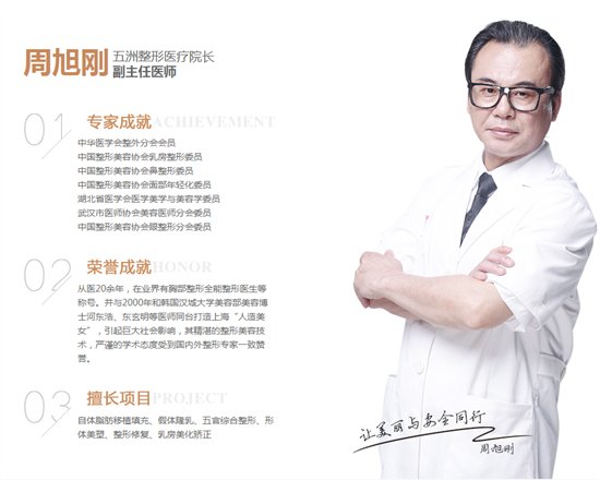 周旭刚作为武汉五洲整形医疗院长,从医20余年,在业界有胸部整形全能整形医生等称号。在2000年和韩国汉城大学美容部美容博士河东浩、东玄明等医师同台打造上海“人造美女”,引起巨大社会影响,其精湛的整形美容技术,严谨的学术态度受到国内外整形专家一致赞誉。他一直强调,整形不是儿戏,安全塑美是武汉五洲整形一直在践行的事情。