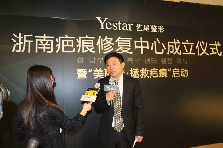 上图为谭军教授在浙南疤痕修复,成立仪式现场接受媒体专访