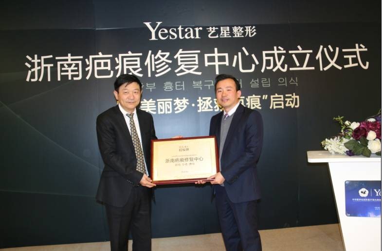 上图为谭军教授与温州艺星皮肤美容,主任缪水云共同为浙南疤痕修复,成立仪式揭牌