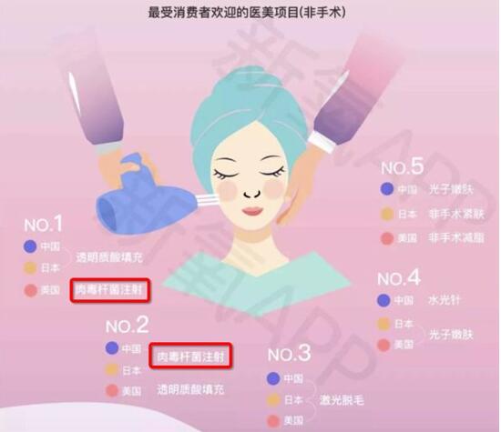 根据《新氧2018年医美行业白皮书》,中国医美产业今年预计将达到2245亿,有近2000万人通过医美变美。无论是在中国,还是在美国和日本,肉毒注射均为,的医美项目。