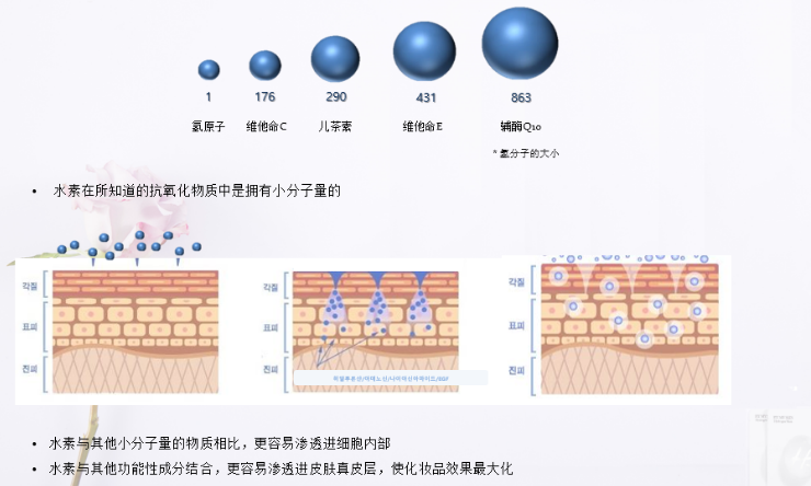 •水素与其他功能性成分结合,更容易渗透进皮肤真皮层,使化妆品效果,化。