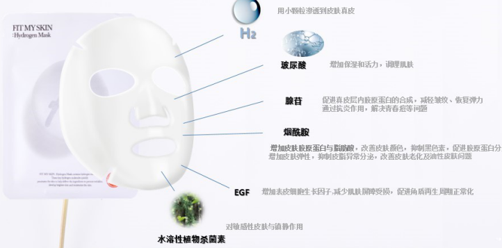 面膜中添加了玻尿酸、腺苷、烟酰胺、EGF、水溶性植物杀菌素等功能性成分,与水素相辅相成,形成了、堪称,的皮肤护理方案。