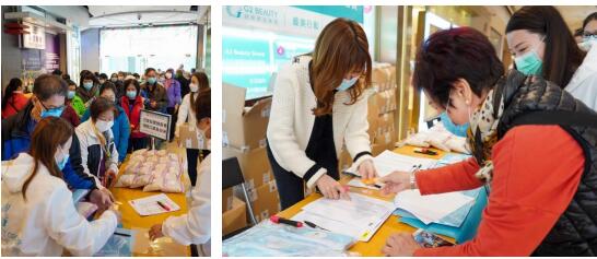 为了更好的贯彻“以爱治企”,许玉焕博士率先垂范,率领集团员工参与到关爱长者行动中。 2020 年 2 月 19 日,在许玉焕博士亲自率领下,在 G2 Beauty 香港分店,为当地长者们组织了一场善捐活动,现场向 500 位长者们派发出 2500 只口罩和 500 包米。