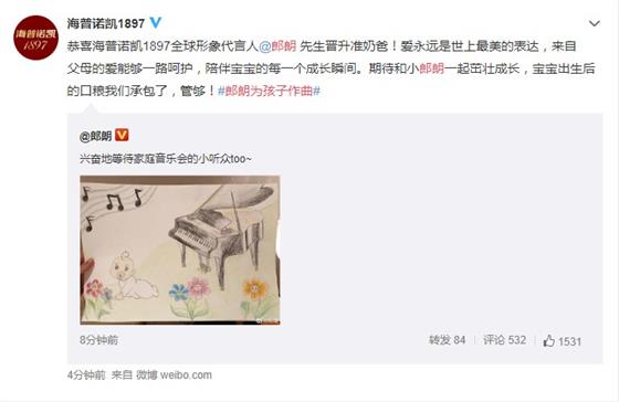 10月7日,在海普诺凯1897“用爱成就”音乐盛典上国际钢琴大师郎朗发布了一首为新生而作献给孩子的原创钢琴曲《致爱心声》,并同步在网易云音乐上线。
