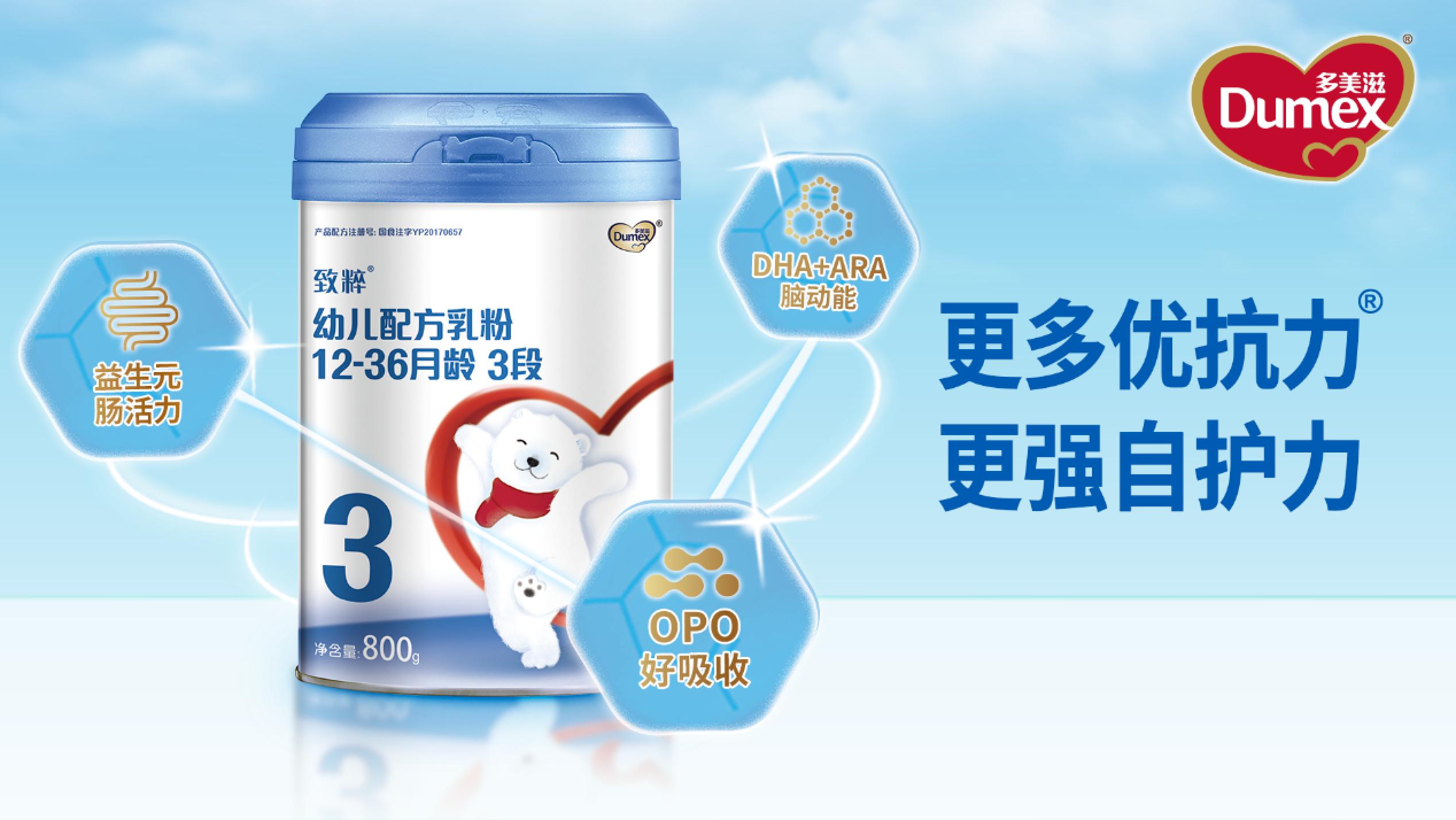 而多美滋致粹的肠道优抗力配方——拥有亲和结构脂OPO加上专利9:1配比的双链益生元组合,从肠道免疫和吸收两方面,协同守护肠道健康。