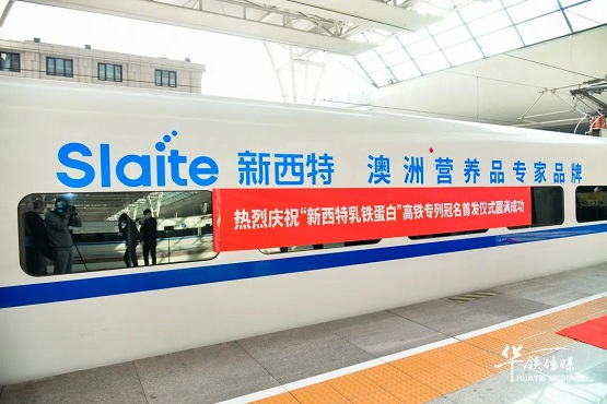2020年10月30日,新西特冠名高铁列车,仪式于上海站举行,车身上“Slaite新西特 澳洲营养品专家品牌”几个字格外吸睛,走进车厢内,行李架、枕头巾、小桌板、车窗等多处布满“新西特”的贴纸、海报,自此“断奶就加新西特”的品牌口号将伴随高铁列车传至大江南北。