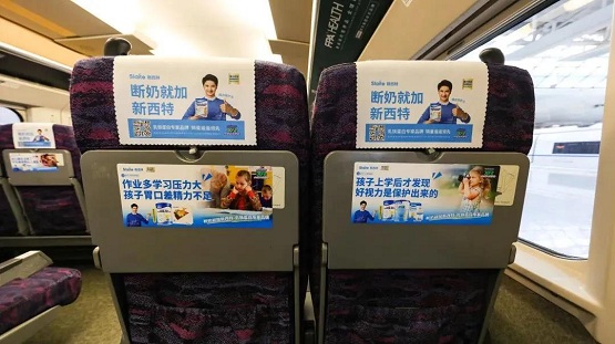 走进“新西特”高铁冠名列车,震撼的全车媒体,彰显新西特品牌实力。“断奶就加新西特”的广告语无处不在,品牌形象立体化展现在乘客眼前。滚动字幕循环播放在列车LED显示屏上,伴随着“新西特提醒您,前方到站某某站”的语音播报,让高铁列车成为新西特的专属移动名片,将“断奶就加新西特”的品牌理念以“新西特乳铁蛋白”高铁号的速度向外传播。
