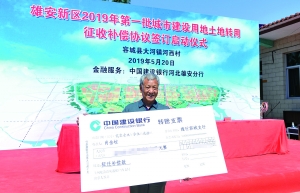 5月20日,河北雄安新区容城县启动河西村、龚庄村集体土地征收签约工作,标志着雄安新区第一批城市建设用地转用征收工作进入正式实施阶段。图为容城县河西村村民肖金柱领取征收补偿资金转账支票。