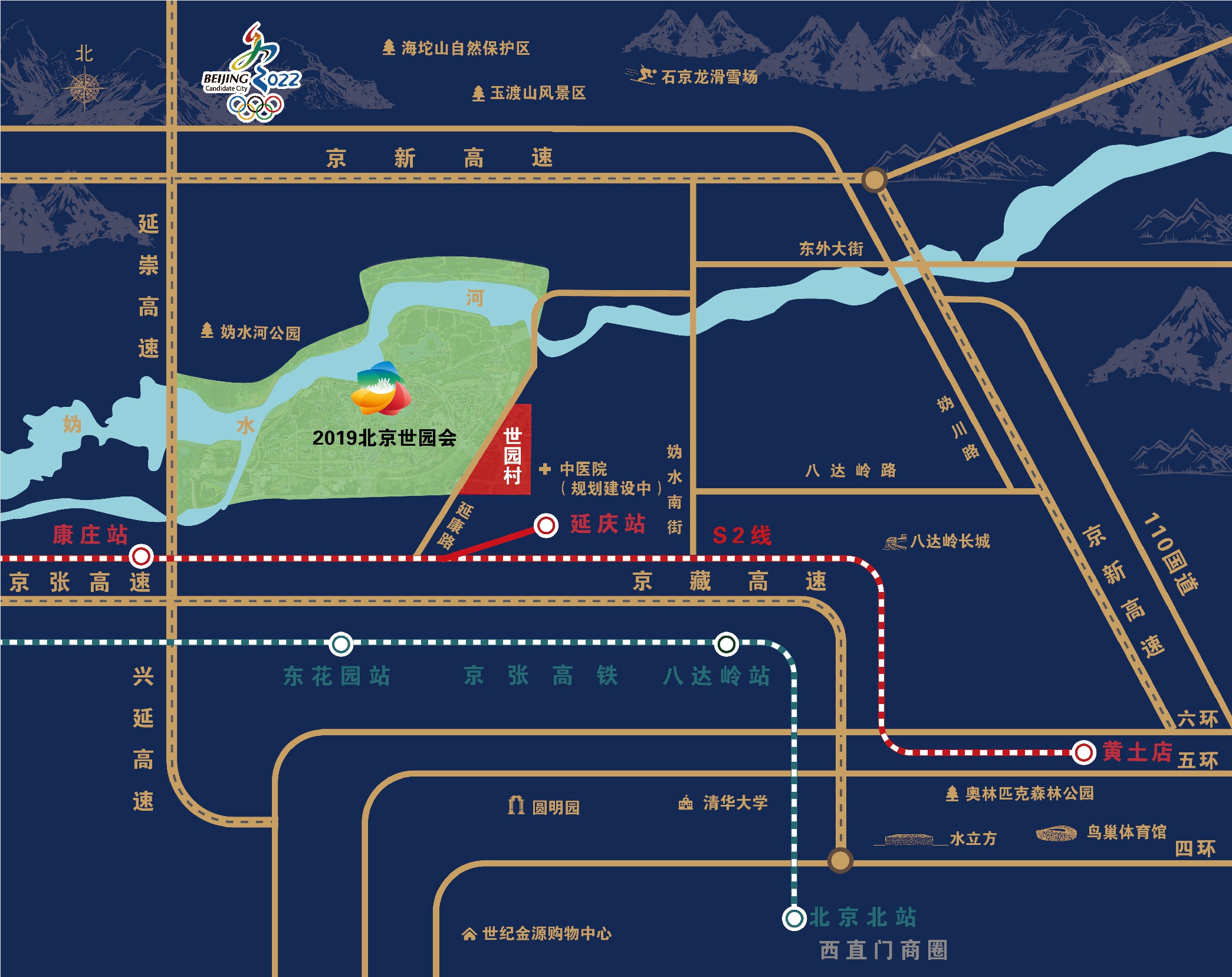 从位置来看,世园村位于延庆新城核心,与世园公园仅一路之隔。距延庆老城西南2.5公里,距离北京74公里。盛会之后迎来的交通大升级,不仅让世园村与延庆老城区快速连接,还可实现30分钟快速通达北京城区,极大的提升了便利性。