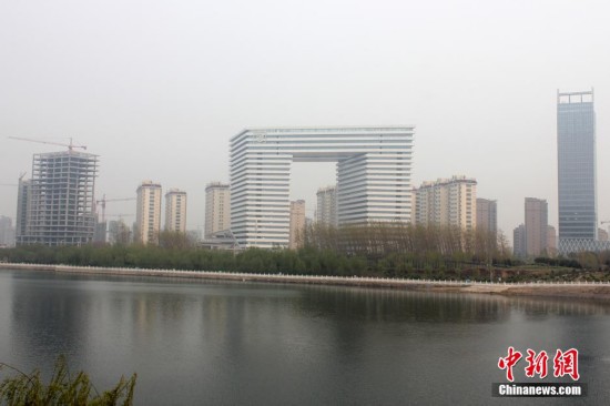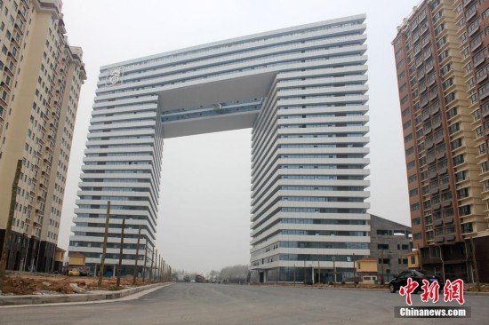 4月13日,河南省鹤壁市淇滨区淇水大道与珠江路交汇处,一栋即将完工的高层建筑横跨马路而立,外观酷似一个板凳,引得经过的市民纷纷驻足观看,连声称奇。据了解,“板凳大楼”是鹤壁市“9+1”,工程项目之一,为河南省首座跨路景观大厦,占地面积41亩,总建筑面积约9万平方米,总投资约4.5亿元,由两栋高约86米的建筑横跨在珠江路两侧,宛如“龙门”形状。