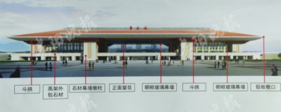 李思伟介绍,该站以“黔中新秀、生态独韵”为设计理念,在装饰装修细节上凸显贵州多民族文化内涵:进站大厅以素雅的色调、优美迤逦的图案、丰富悠久的文化内涵设计了两幅巨形浮雕,体现了贵州蜡染为世界非物资文化遗产特色;外墙面窗花以苗族、侗族、壮族三种民族图案抽象设计,实现了与民族特色的,结合;外墙与屋面檐口采用钢结构斗拱造型,层次分明、亮点突出,体现了中国古代建筑斗拱的特点,实现了屋面和建筑四周的,过渡与精美和谐;屋面安装半圆形铝合金型材,整体风格大气磅礴,使仿古建筑与现代金属屋面的,融合,实现了新旧建筑风格的传承。