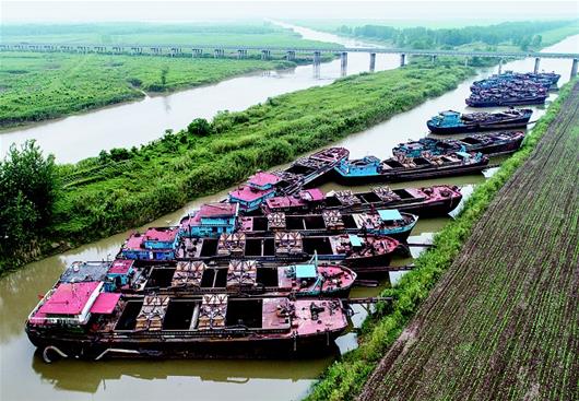 图为:非法采砂船被集中到东荆河河道内等待拆解。(湖北日报全媒记者 魏铼 摄)