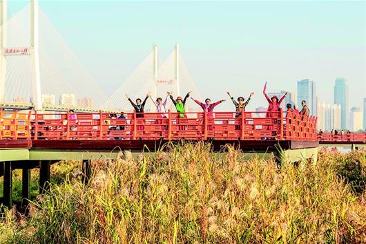 图为:市民在汉口江滩新建的芦花栈道上游玩。