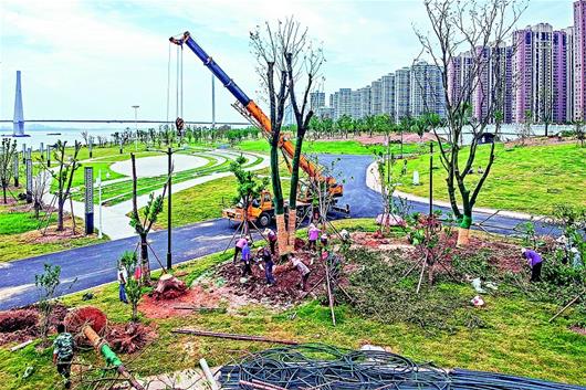 图为:武昌余家头非法砂石码头和违法建筑被拆除后,园林工人在栽种树木和草皮。