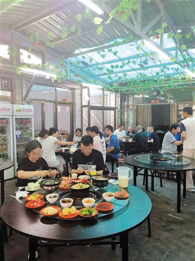 柳沟农家院中吃豆腐宴的游客。
