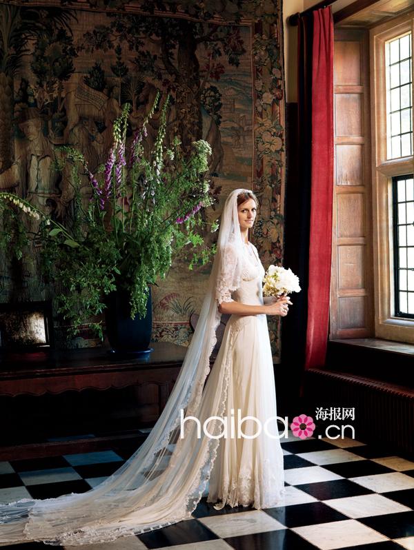 英国设计师爱丽丝·坦波利 (Alice Temperley) 为Jacquetta Wheeler设计了白色蕾丝婚纱。新郎新娘牵着白马前往结婚仪式现场,一座修建于15世纪的教堂,然后乘坐蓝色宾利(Bentley)婚车回到城堡,和宾客们一起参加其他的庆祝活动,婚礼晚宴后还有很浪漫的焰火晚会哦。