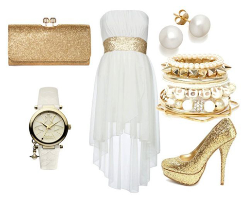 金色宽腰带高腰线雪纺纱裙,光是一件裙子上身就让整个人仙气十足。如果再脚踩一双金色防水台高跟鞋,手拿金色扳扣包包,立刻彰显珠光宝气的公主范儿。配饰,轻重有致,跨装的手镯和简单的耳钉形成鲜明的对比,这样也会让整体装扮显得错落有致。