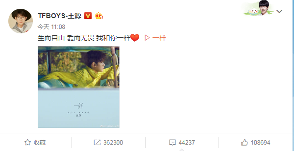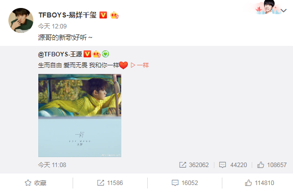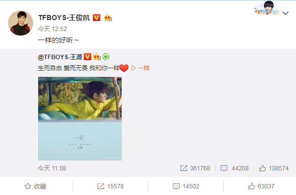6日,王源发微博宣传自己刚发行的新歌,王俊凯和易烊千玺也纷纷转发,帮其打call,称:“源哥的新歌好听”“一样的好听”等,三人之间俏皮互动也引发粉丝感叹感情好。
