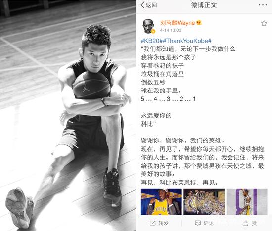 曾经打过职业篮球赛的香港艺人余文乐,就在微博贴出他青涩时期和科比的合照,写着“有幸遇见”。林俊杰[微博]和潘玮柏也晒出了合照,潘玮柏还煽情地写道:“20年了,已经习惯他在的日子,而明天过后,都不一样了。人生真的没有永远。珍惜现在你喜欢的人事物。”可见,明星追星,还是有精神层面的追求的。