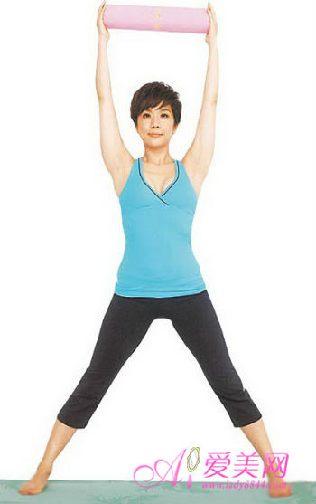 双腿张开约与自己腿长同宽站立,双手握美人枕或毛巾往头顶方向延伸,吸气预备。
