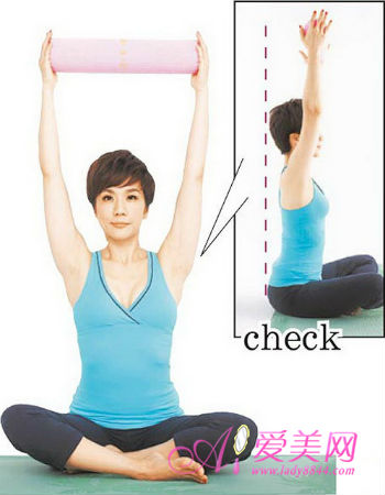 双腿盘坐,吸气双手举约与肩同宽的美人枕往上延伸,背部和手肘都伸直。背部尽量打直,往头顶方向延伸。