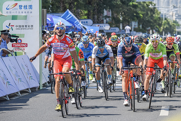 对于车迷来说,马尔科·本法托这个名字并不陌生,这位自2014年以来已经在中国赛场获得过13个赛段,的意大利冲刺手,今天终于在海南收获了第一场环岛赛胜利。赛后,在谈到自己的表现时他说:“今天平路赛段是由我和贝莱蒂负责,的冲刺工作。整场比赛我们都做得非常棒,最终冲刺时我的位置也很靠前。今天比赛速度非常快,终点前我意识到有顶风的状况,因此我在快接近终点线时大力冲刺,最终赢下了比赛。我有许多中国赛场的比赛经验,但这是我第一次获得环岛赛赛段,,感觉太棒了!”
