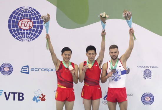 在世锦赛分量最重的男子网上个人角逐中,中国选手高磊以62.255分夺冠,夺取三连冠,成为24年来首位实现这一成就的男运动员。此前,俄罗斯的亚历山大·莫斯卡连科曾在1990、1992及1994年夺冠。高磊的,实至名归,在预赛、半决赛中就分别以114.7分、61.495分,。奥运,董栋同样发挥较高水平,以61.185分获得亚军,俄罗斯选手尤金以60.95分获得季军。
