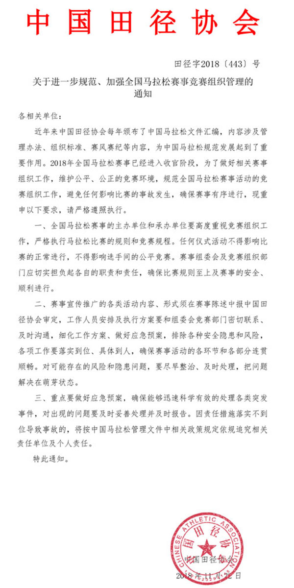 人民网北京11月23日电(杨磊) 11月22日晚,中国田径协会在官网发布了《关于进一步规范、加强全国马拉松赛事竞赛组织管理的通知》。《通知》中指出:任何仪式活动不得影响比赛的正常进行,不得影响选手间的公平竞赛。