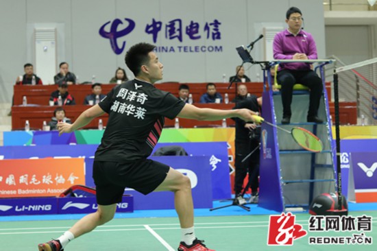 男单比赛,湖南队由周泽奇迎战中国香港选手伍佳朗。对面强敌,近来状态火热的周泽奇没有让胜利从自己手中溜走。在扛住了对手的凶狠进攻后,年轻的周泽奇用充沛的体能和技战术策略逐步占据上风,最终15-12、15-11击败对手,为湖南队扩大总比分。