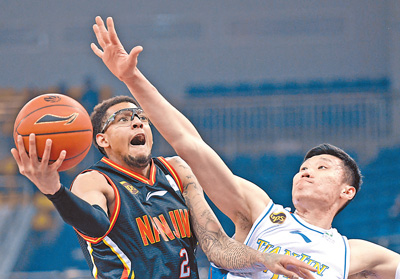 1月3日,同曦队球员奥斯汀(左)在比赛中上篮。当日,在2018—2019赛季CBA(中国男篮职业联赛)常规赛第二十八轮比赛中,天津队在主场以110∶102战胜同曦队。
