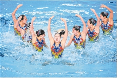 5月6日,2019年全国花样游泳,赛在北京英东游泳馆结束。图为京苏鄂队在集体自由自选比赛中。最终她们以88.3333分的成绩获得第一名。