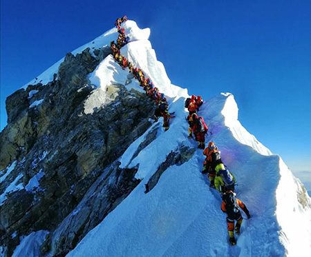 今年春季,西藏登山协会共向来自33个国家的144名国际登山者以及12名中国登山者共9支登山队伍颁发了登山许可,并要求各支队伍为每名登山爱好者配备至少一名向导。在南坡,尼泊尔旅游部门共发放了381张登山许可证,每一位登山者还至少会雇佣一位登山向导,估计从南坡攀登珠峰的人数超过800人,远远超过了珠峰的承载能力。