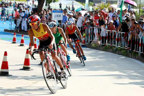 自行车赛道两旁鲜花盛开,景色宜人,美中不足的是大雨过后路面仍有些湿滑,白起利未能保持游泳赛段的领先优势,而来自香港特别行政区的伍泰龙在自行车赛段表现了强劲的实力,最终将领先优势保持到,,获得体校组甲组半程的,,也是本次二青会铁人三项首金,张弛、王铭宇分列二三名。