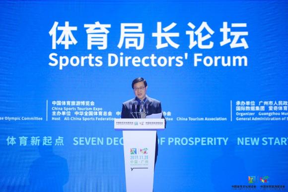 11月28日下午,2019中国国际体育文化体育旅游高峰论坛-体育局长论坛在2019两个博览会期间成功举办。论坛上,国家体育总局政策法规司副司长李志全致辞,天津市体育局局长李克敏、黑龙江省体育局局长陈哲、广东省体育局局长王禹平、新疆维吾尔自治区体育局党组书记聂春作主旨报告,他们围绕《体育强国建设纲要》,结合本省实际探讨如何推动各地体育事业协调发展。国家体育总局有关部门、单位及各省区市体育局相关负责同志等齐聚论坛现场,论坛由国家体育总局体育文化发展中心副主任吉伟东主持。