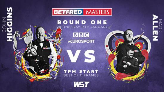 希金斯与艾伦的比赛在当地时间晚间开始,两人此前四次在大师赛中交手,艾伦保持全胜。比赛的进程和前一场如出一辙,希金斯上半场取得3-1的领先,艾伦则在休息归来后追至3-3。此后,希金斯打出单杆84和80分,连续两局零封对手,5-3拿到赛点,艾伦追至4-5,并在第10局延分状态下完成单局逆转,打成5-5平。决胜局,希金斯在艾伦第三次失误后艰难完成超分,并在一回合防守后打进远台咖啡球,6-5惊险取胜,职业生涯,在大师赛击败艾伦。
