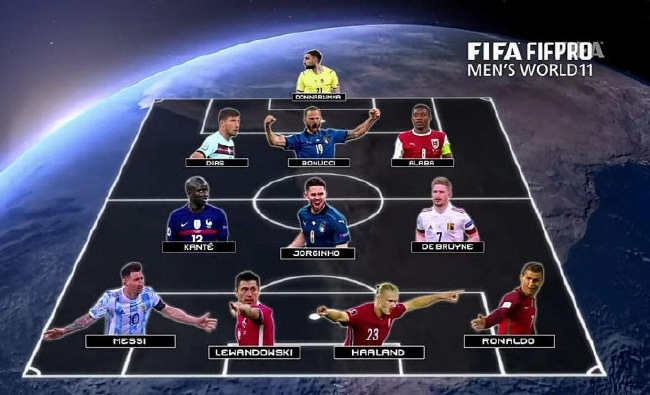 FIFA最佳阵容:唐纳鲁马(AC米兰/巴黎圣日耳曼);阿拉巴(拜仁/皇马)、迪亚斯(曼城)、博努奇(尤文);若日尼奥(切尔西)、坎特(切尔西)、德布劳内(曼城);C罗(尤文/曼联)、哈兰德(多特)、莱万(拜仁)、梅西(巴萨/巴黎圣日耳曼)