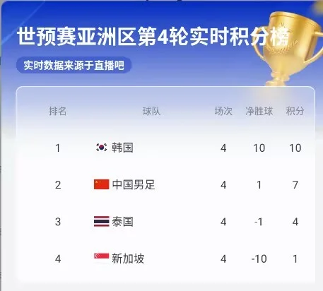 直播吧3月26日讯 世预赛亚洲区第二阶段C组第4轮,国足4-1新加坡,泰国目前0-2落后韩国。若泰国本场比赛以0-2结束,则国足下轮赢下泰国即可提前一轮出线,平泰国则很可能要比拼净胜球,输泰国则大概率出局。