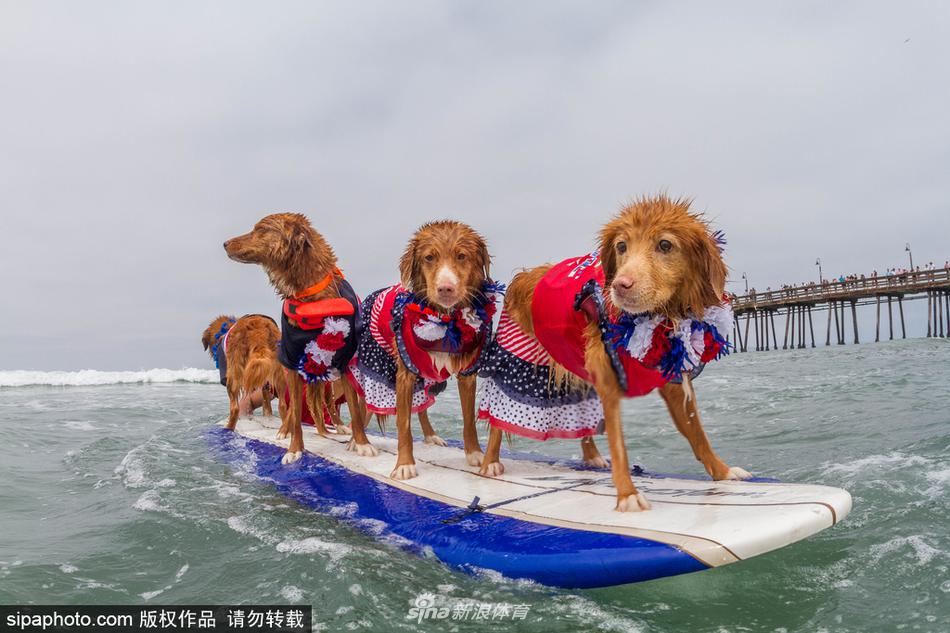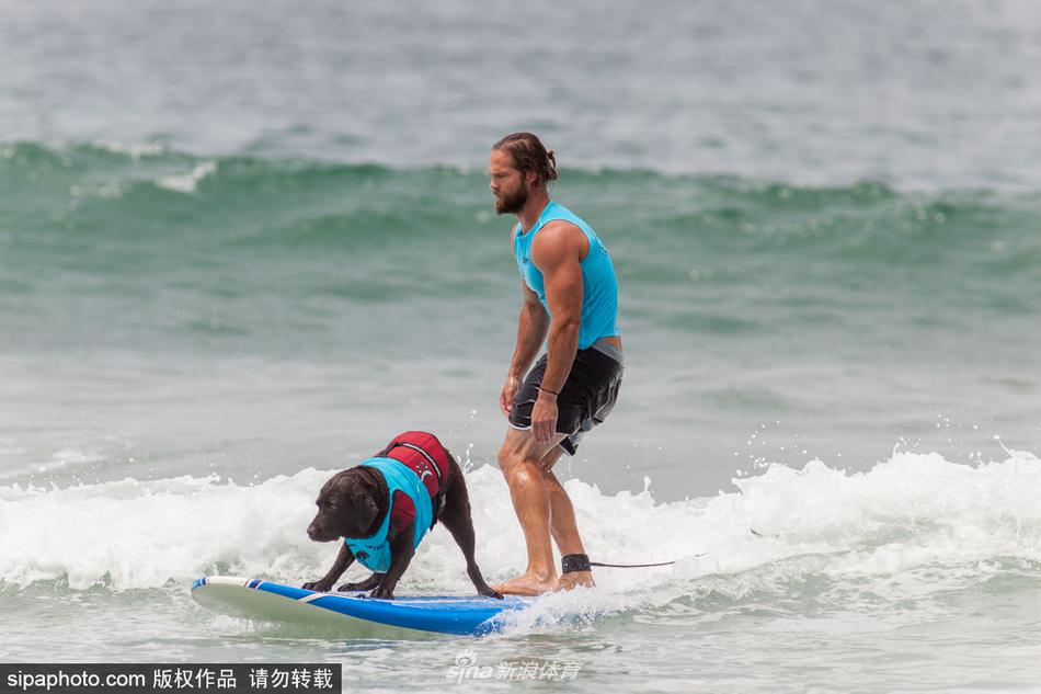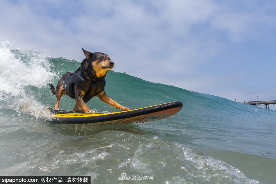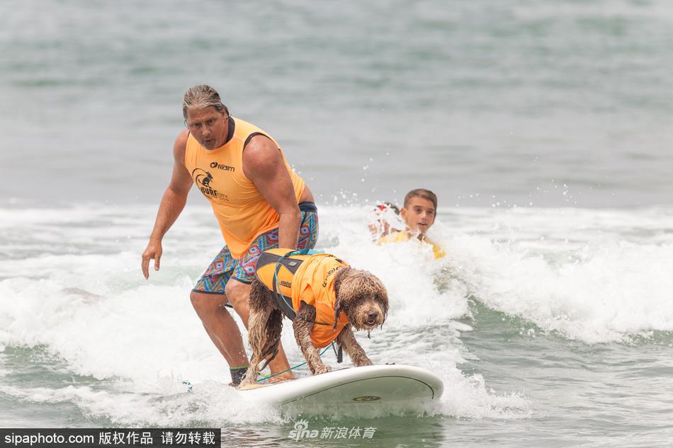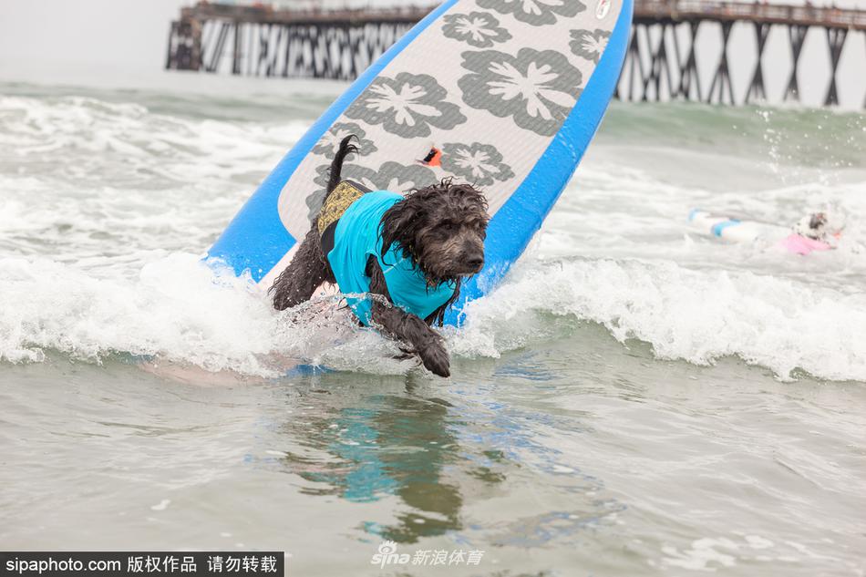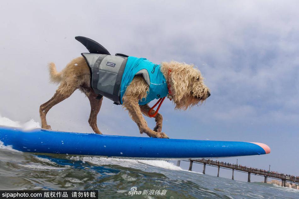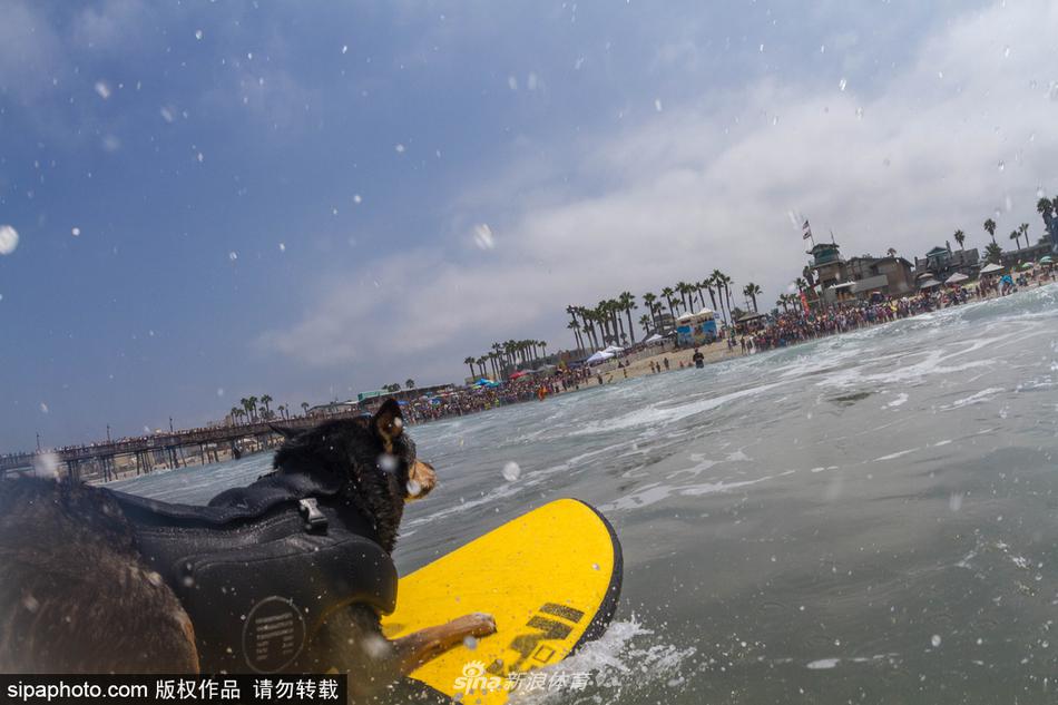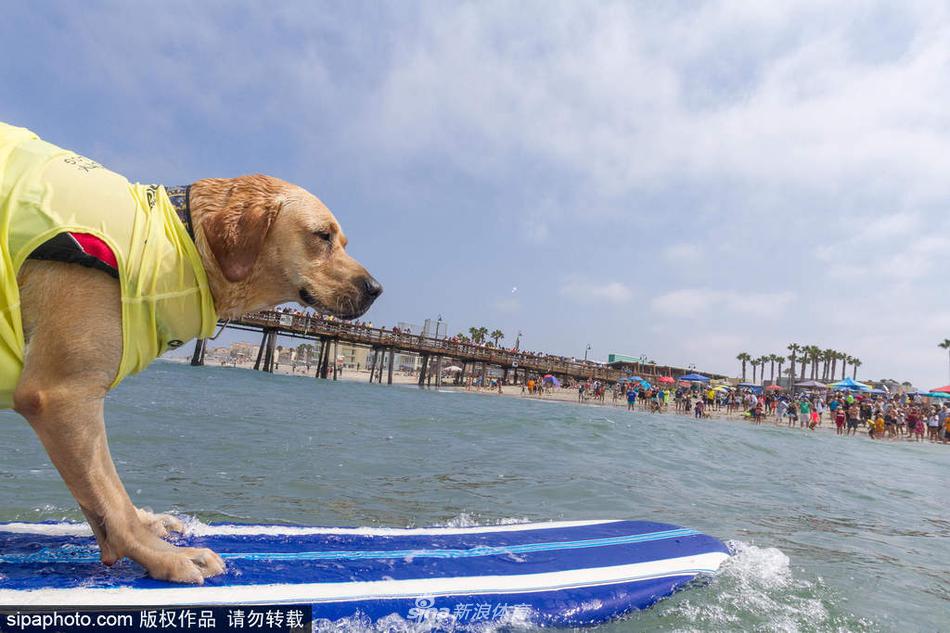 当地时间2017年7月29日,美国加州,狗狗们在,海滩冲浪,萌态十足。