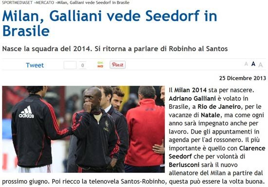 12月25日,是西方传统的圣诞节,但据意大利《慢镜头》消息,加利亚尼在这,登上了飞赴里约热内卢的班机,加总此行有两个最主要的目的:一是说服西多夫接替阿莱格里担任米兰的新教练;二则是与桑托斯商讨罗比尼奥的转会事宜。