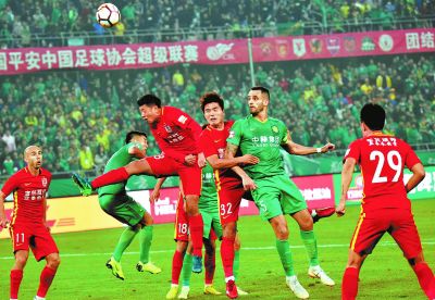 21日,中超联赛第26轮北京国安主场战平长春亚泰,国安外援奥古斯托在对方禁区内争抢头球。 本报记者 和冠欣摄