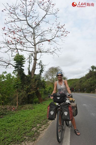 3月10日中午,丽娜·妮蔓骑车穿过海南白沙黎族自治县邦溪风情小镇。在G225国道上,她一边欣赏路边盛开的红色木棉花,一边快速蹬车,向目的地海口挺进。“估计明天晚上我就可以到达海口。海南,真是美得令人陶醉。”丽娜开心地说。