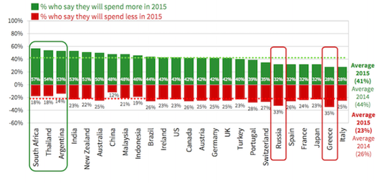 调查还发现:俄罗斯和希腊是减少旅游预算比例,的两个国家,分别为 33%和 35%(平均水平为23%)。前者是因为受到西方国家的制裁以及卢布下跌的影响,而后者则是由于紧缩政策及欧元贬值的双重压力。